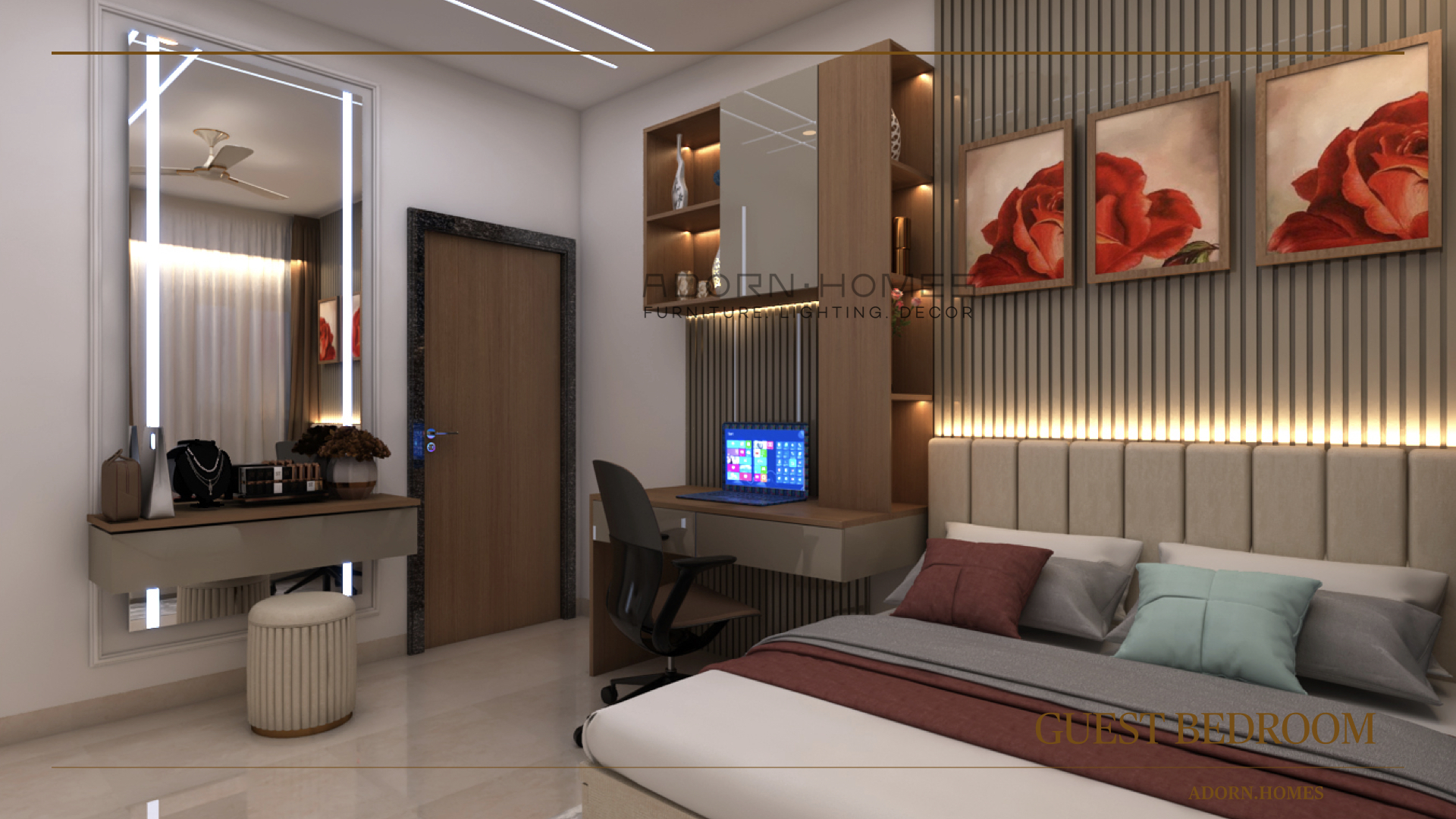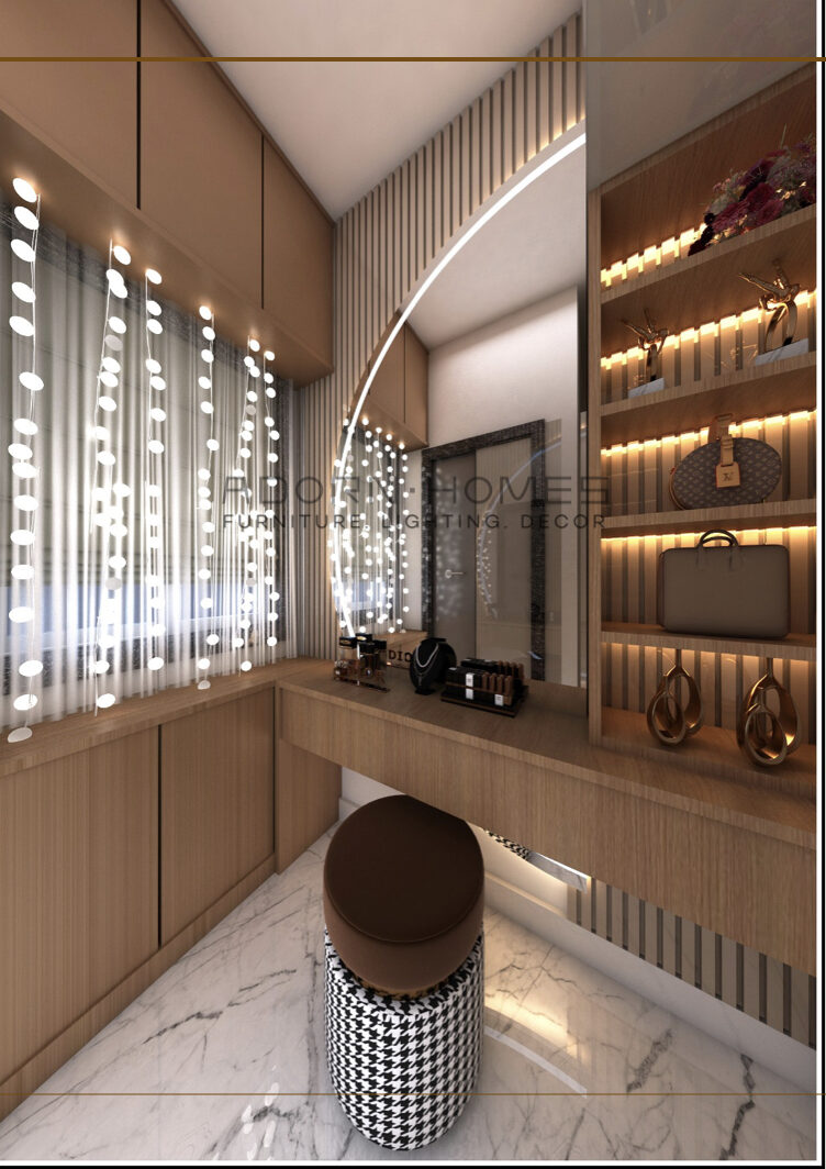 | Project Highlights | 1. Special Puja Room 2.TV Room With Back Wall Highlight With Glass And Laminate Mix Material 3. Dressing Room With Half Round Mirror Highlight With Beautiful Light 4. Greatly Emproved Lighting In Rooms With Special Geometric Patterned Headboard |